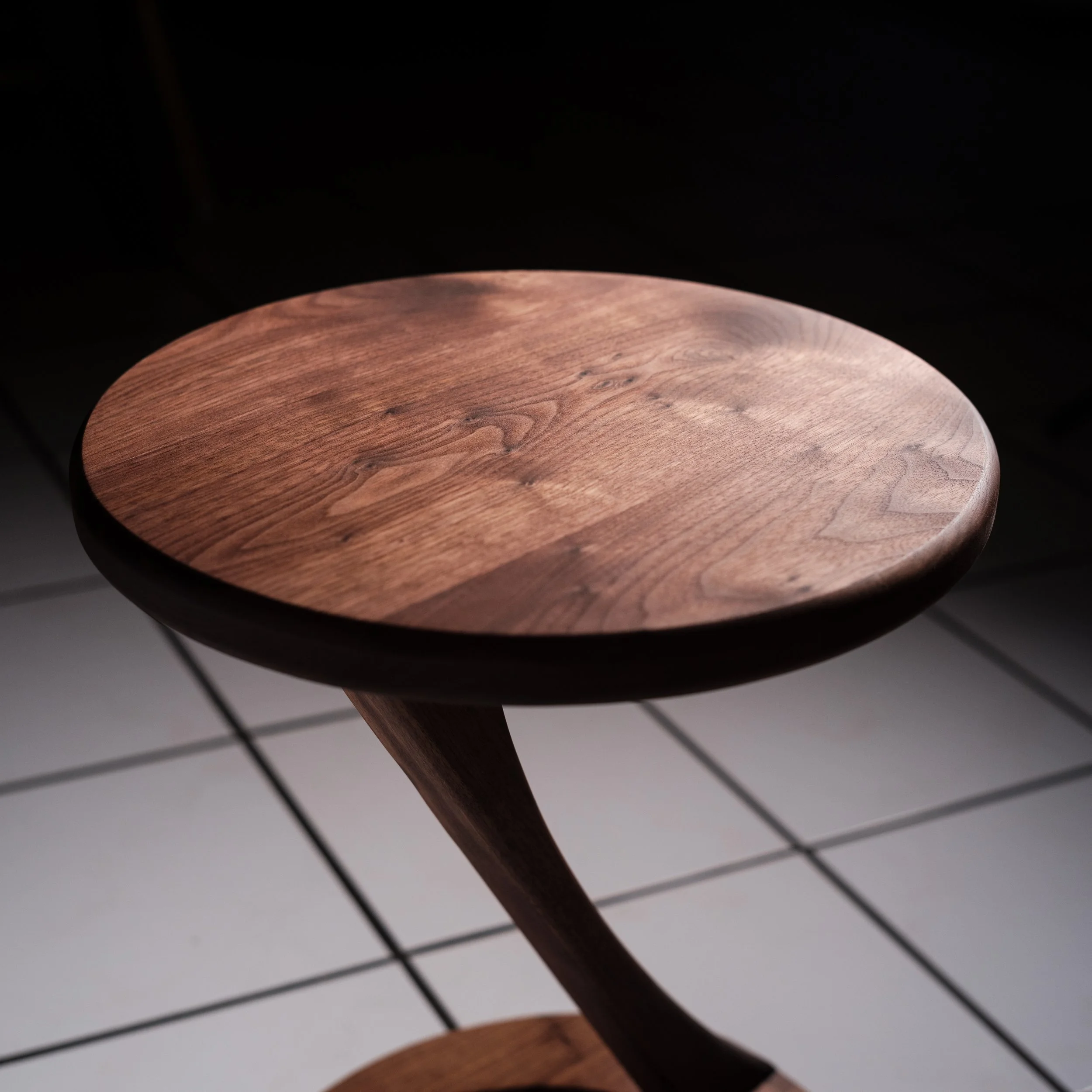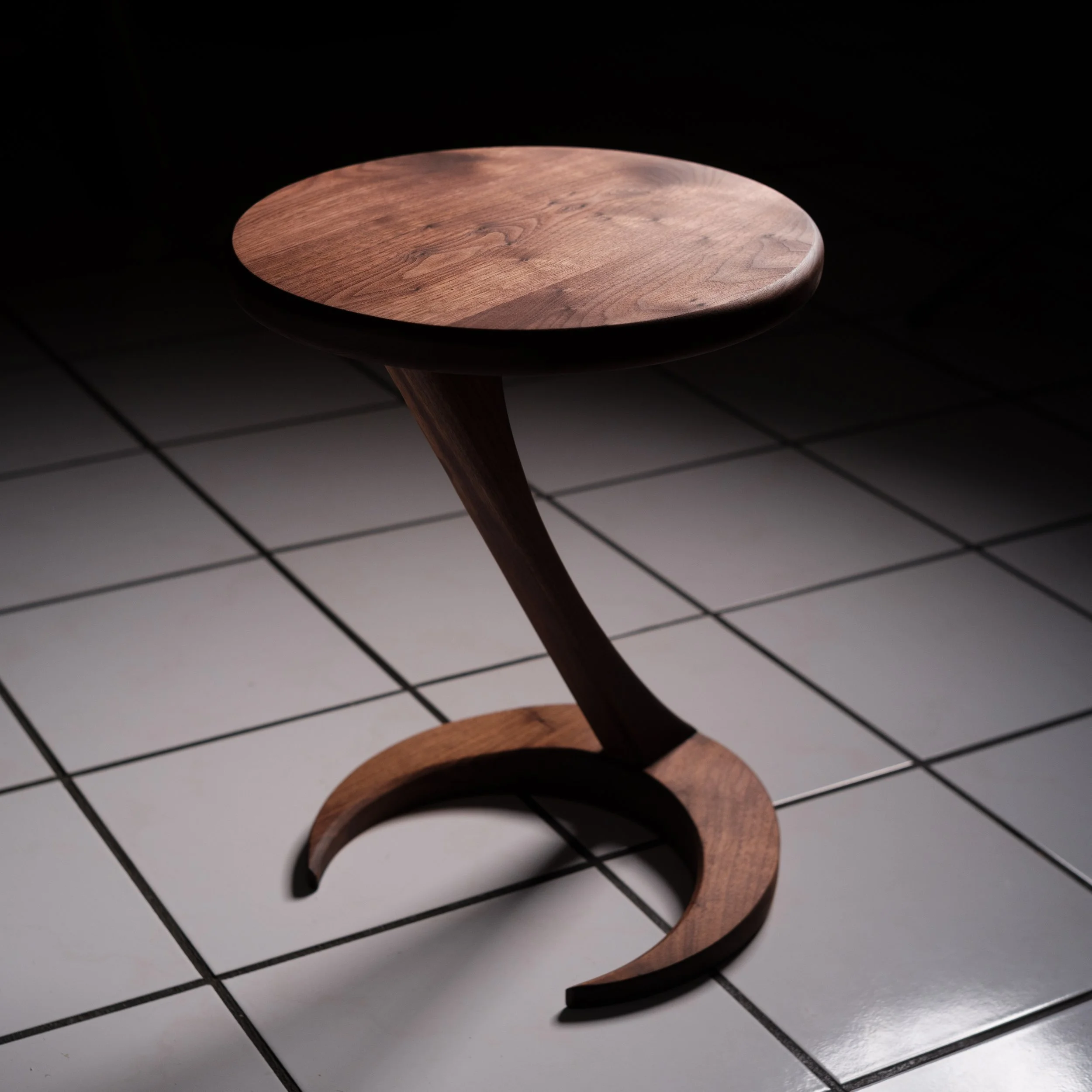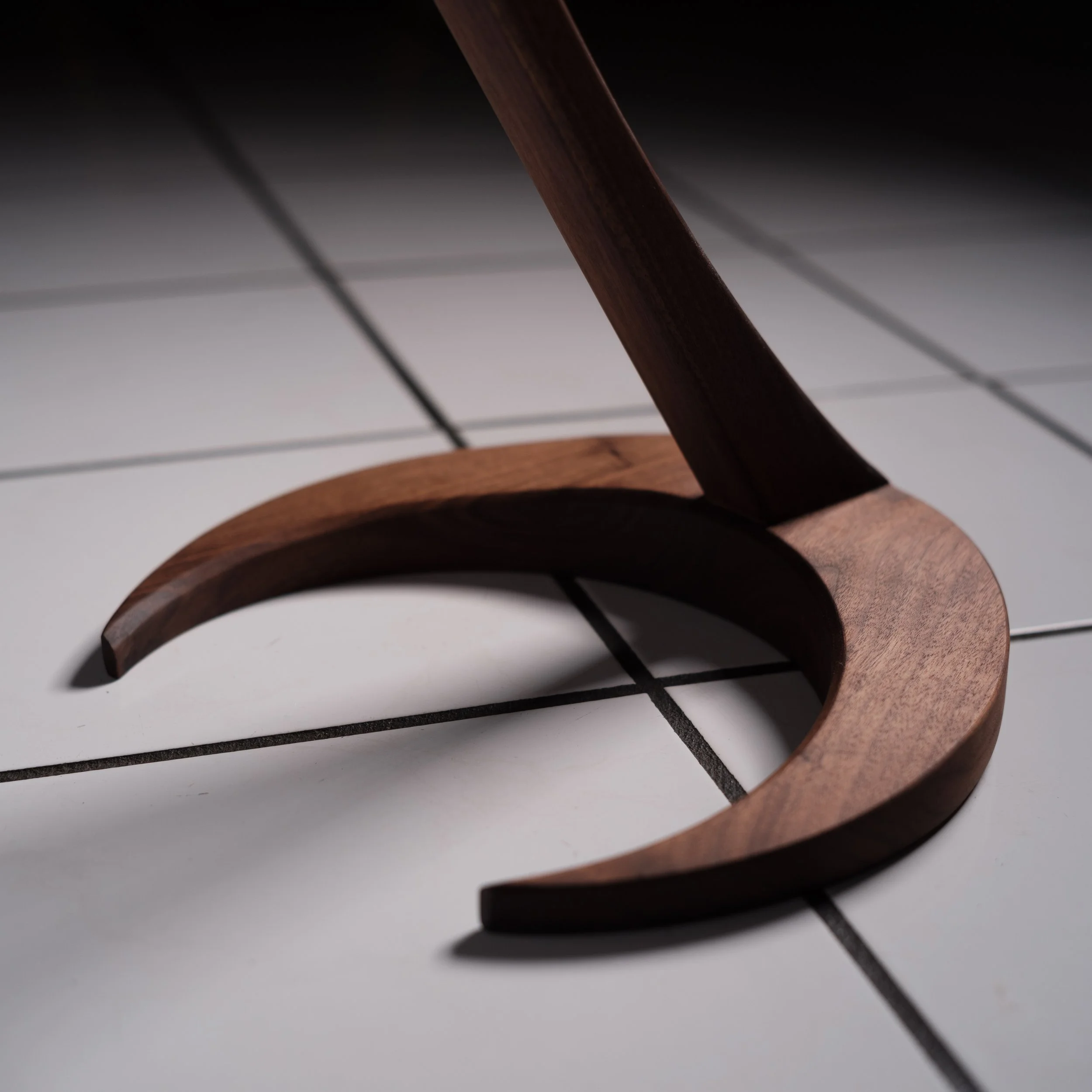 In the show, the Koi fish spirits, Tui and La, or push and pull in Chinese, keep the ocean and moon in balance. Taking this idea and representing it by the cantilever design of the base. Made fully from walnut hardwood, this piece flows with simple and unique details such as the sloping and tapered crescent base.