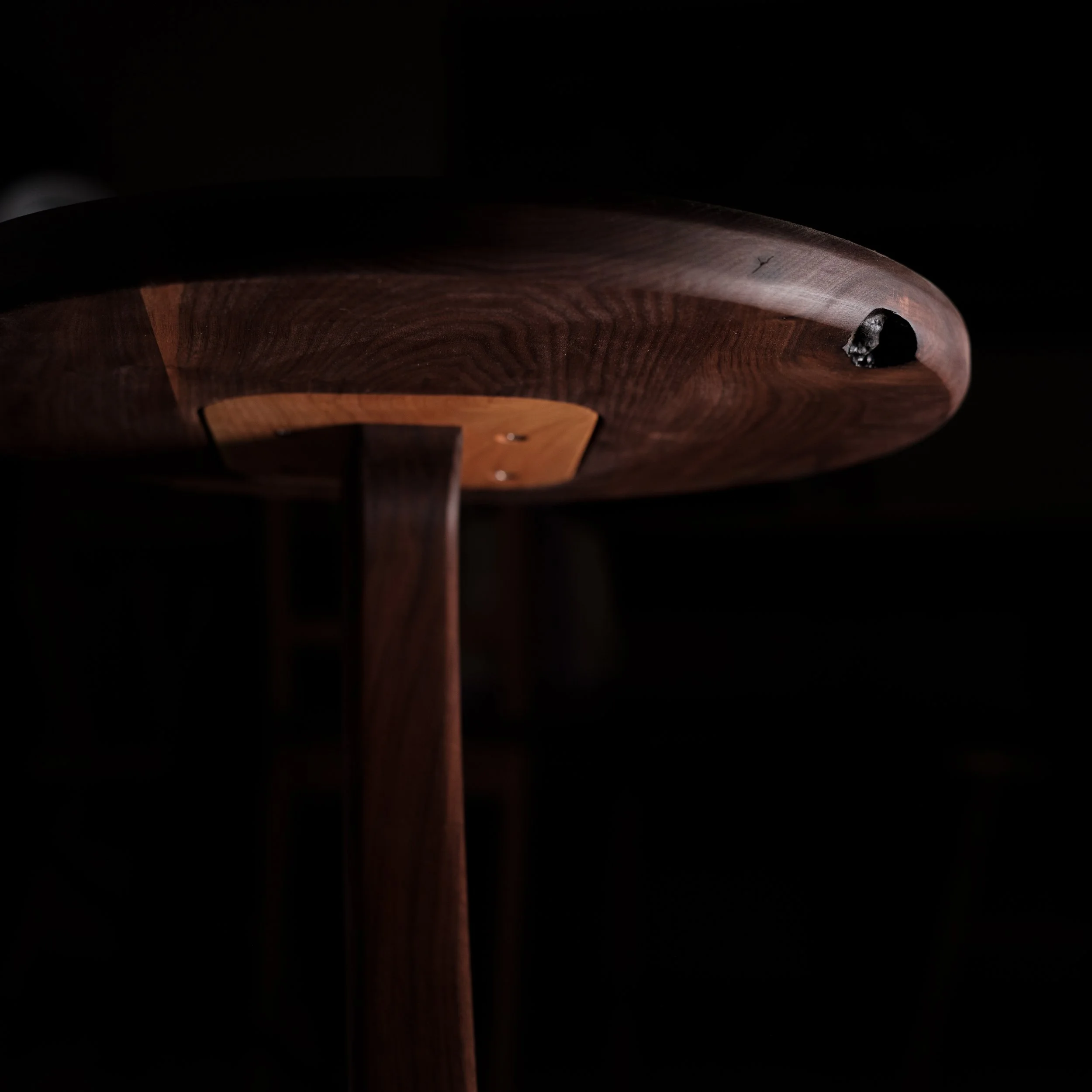 Following the popular trend, we had taken two walnut live edge slabs and combined them using a deep pour resin epoxy with a black dye. Intentionally avoiding a pure black pour, we used the dye sparingly to maintain a subtle depth seen when looking into the table.